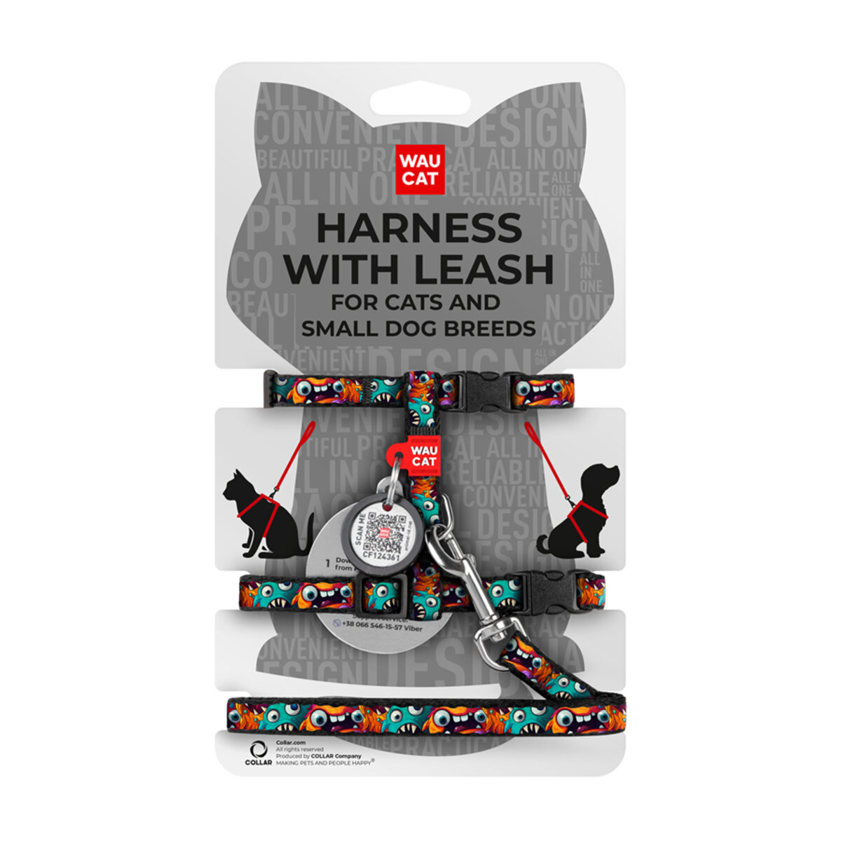 Шлея з повідцем WAUCAT Nylon “Зубасті монстри” для котів та дрібних собак, нейлон, XS, Ш 10 мм, В 25-40 см, С 20-30 см
